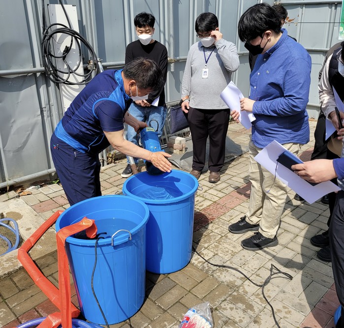 경기 수원시 장안구는 28일 여름철 자연 재난에 대비하고자 구청과 동 재해 담당 직원을 대상으로 ‘수방자재 및 양수기 사용법에 관한 교육’을 실시했다. 사진은 수해상황 발생을 대비해 양수기 작동법을 교육하고 있는 모습. (사진제공=장안구청)