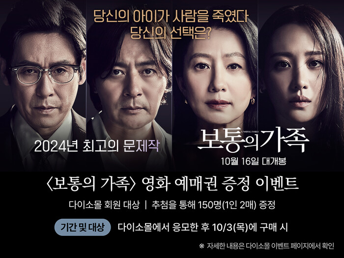 이번 이벤트는 오는 3일까지 다이소몰 이벤트 페이지에서 사전 응모 후 3일 하루 동안 구매한 고객을 대상으로 추첨을 통해 <보통의 가족> 영화 예매권을 증정한다. 당첨자는 오는 7일 다이소몰 이벤트 페이지에서 발표할 예정이며, 자세한 사항은 다이소몰에서 확인할 수 있다.