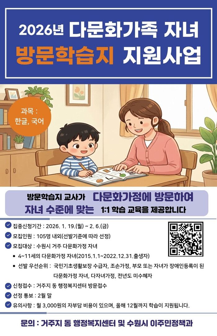 [수원=임종인 기자] 경기 수원시가 다문화가족 자녀에게 한글·국어 방문학습을 지원하는 ‘2026 다문화가족 자녀 방문학습지 지원 사업’ 참여자를 오는 2월6일까지 모집한다.