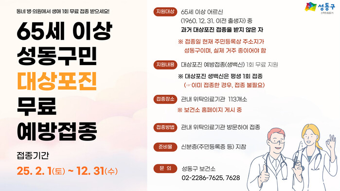 [시민일보 = 박소진 기자] 성동구(구청장 정원오)가 65세 이상 노인 대상으로 대상포진 무료 예방접종을 실시하고 있다고 밝혔다.