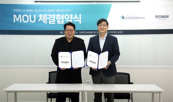 ㈜한국직무능력평가연구소(이하 직능연, 대표이사 우원식)는 지난 13일 ㈜메사쿠어컴퍼니와 ‘안면인식 AI 비대면 시험 플랫폼 공동 상용화 MOU’를 체결했다