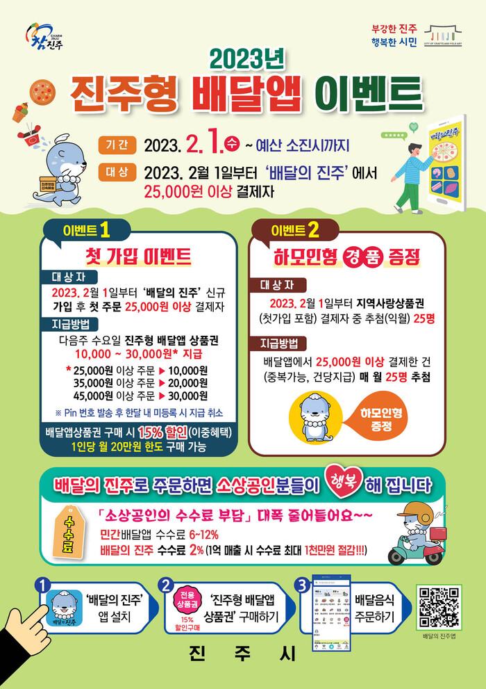 진주시는 배달앱 시장의 높은 중개수수료에 비해 2%의 낮은 중개수수료로 소상공인의 부담을 완화하고 지역사랑상품권 사용을 확대하여 소비자의 편의를 도모하기 위해 진주형 배달앱인‘배달의 진주’전용 상품권을 역대 최대 15% 할인하여 판매하고 있다.
