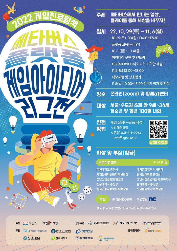 ‘메타버스에서 만나는 일상, 플레이를 통해 세상을 바꾸자’를 주제로 하는 이번 리그전은 학생과 청년들에게 게임 제작과 진로 탐색의 기회를 제공하기 위해 성남시와 게임문화재단(성남게임힐링센터)이 공동 주최해 마련하는 행사다.