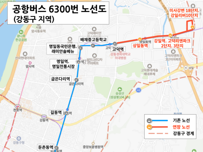 [시민일보 = 이대우 기자] 서울 강동구(구청장 이수희)가 공항버스 6300번이 오는 25일 오전 4시 첫차부터 강일동과 상일동을 지나는 연장 노선으로 운행을 시작한다고 밝혔다.