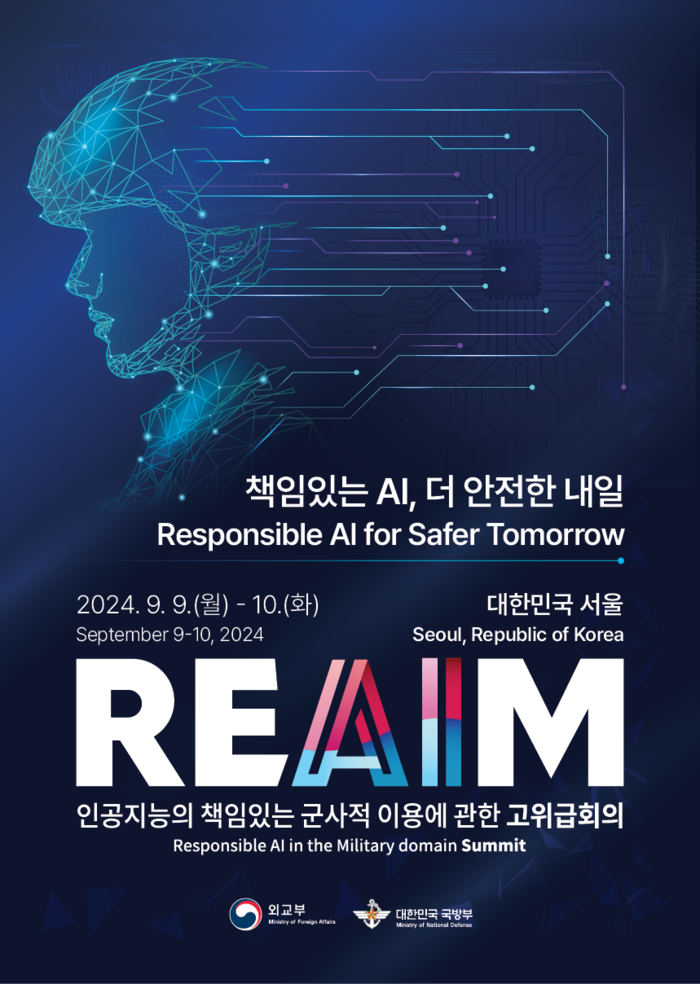 우리 정부는 외교부와 국방부 공동 주관으로 9.9.(월)-10.(화)간'2024 인공지능의 책임있는 군사적 이용에 관한 고위급회의(이하 ‘2024 REAIM 고위급회의’)'를 서울 롯데 및 웨스틴조선 호텔에서 개최할 예정이다. 네덜란드, 싱가포르, 케냐, 영국이 공동주최국으로 참여한다.