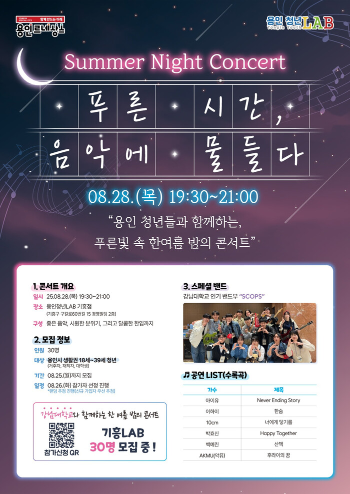 ‘한여름 밤의 콘서트’는 무료로 진행되며, 참여 신청은 24일까지 용인청년포털 ‘청년e랑’을 통해 가능하다.
