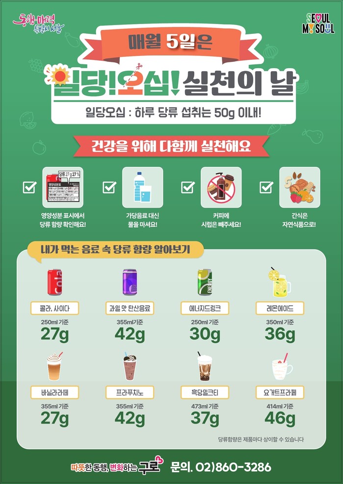 이에 구는 매월 5일을 ‘일당! 오십! 실천의 날’로 정하고 하루 당류 섭취를 50g 이내로 하도록 독려하고 있다.