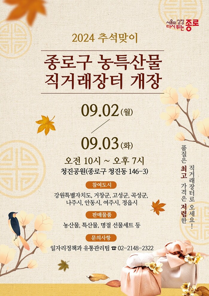 [시민일보 = 이대우 기자] 서울 종로구(정문헌 구청장)가 오는 9월 2~3일 양일간 청진공원(청진동 146-3)에서 「추석맞이 농특산물 직거래장터」를 개최한다.