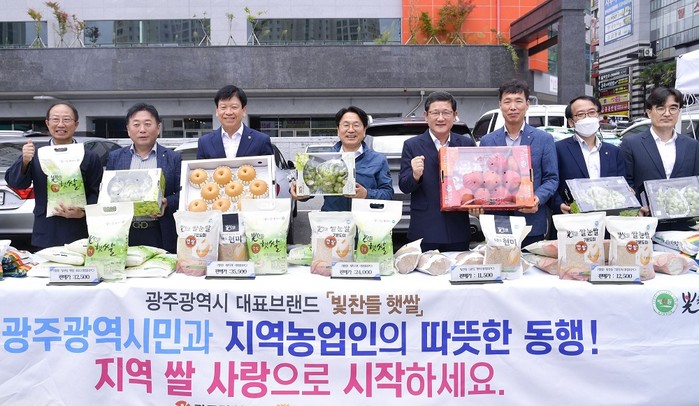 [광주=정찬남 기자] 강기정 광주광역시장(왼 쪽부터 네 번째)이 추석 명절을 앞두고 2일 오전 광산구 농협광주지역본부 주차장에 마련된 농산물직거래장터를 방문해 고성신 광주본부장 및 지역 조합장 등과 농특산물을 들고 기념촬영을 하고 있다./광주광역시 제공
