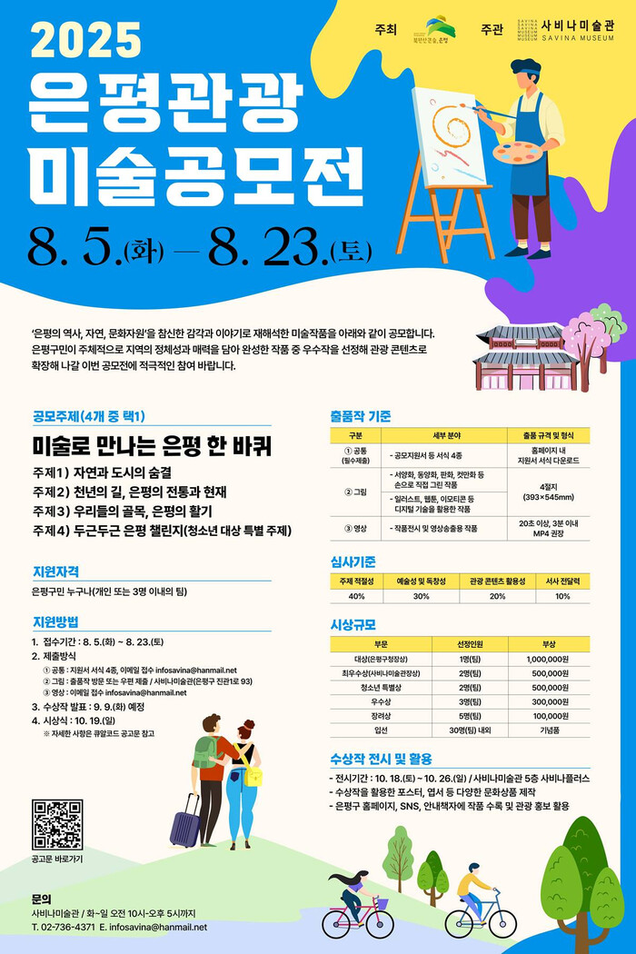 접수는 내달 5일부터 내달 23일까지 진행되며, 은평구민이면 누구나 참여할 수 있다. 공모 신청은 그림(회화, 드로잉, 디지털 드로잉, 웹툰 등)과 영상(20초 이상 3분 이내) 중 선택해 이메일(infosavina@hanmail.net)로 제출하거나, 사비나 미술관에 방문하면 된다.