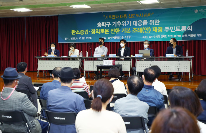 [시민일보 = 이대우 기자] 서울 송파구의회(의장 박경래)가 최근 송파구민회관 2층 소강당에서 ‘탄소중립, 정의로운 전환 기본조례(안) 제정 주민토론회’에 참석했다.