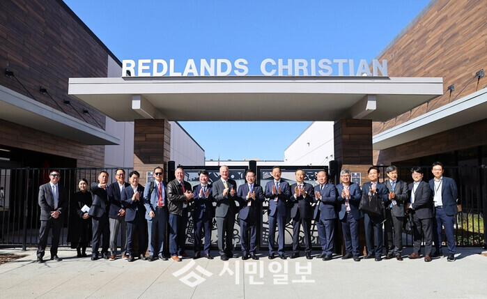 | ▲ 명현관 해남군수(오른 쪽부터 8번 째), 지난.미국 캘리포니아 소재 국제학교 레드랜드 크리스천 스쿨(RCS)에서 유치 업무협약 후 김영록 전남도지()사(7번 째), 관계자 등과 기념촬영 / 해남군 제공 |