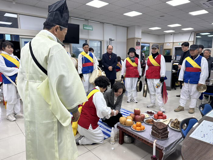 정봉훈 군의회의장, 안상준 청덕농협지점장, 면사무소 직원 등이 참여한 가운데 면사무소 1층 사무실에서 고사 지내는 것을 시작으로 청덕면의 평안과 번영을 기원하는 지신밟기 행사가 펼쳐졌다.