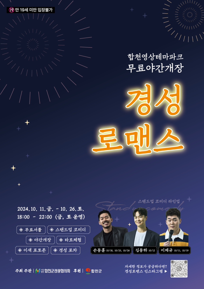 행사를 주최한 (사)합천군관광협의회 이규학 회장은 “영상테마파크의 야간 개장을 통해 관광객을 유치하고, 지역 경제 활성화에 기여할 것”이라며, “맛과 웃음이 함께하는 이번 행사에 많은 관심과 참여를 부탁드린다”고 전했다.
