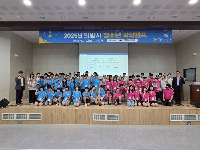 | ▲ 의왕시는 관내 초등학교 6학년과 중학교 1학년 총 45명을 대상으로 지난 14일 한국교통대학교 의왕캠퍼스에서 2025년 의왕시 청소년 과학캠프를 진행한 뒤 참가자들이 기념 촬영을 하고 있다 /사진제공=의왕시 |