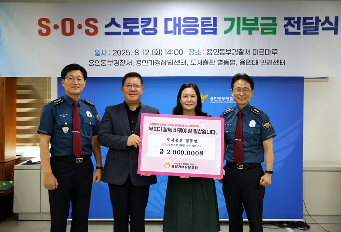 [용인=오왕석 기자] 용인동부경찰서(서장 배영찬)는 25. 8. 12.(화) 14:00,용인동부경찰서, 용인가정상담센터, 도서출판 별똥별과 함께 스토킹 예방을 위한 기부금 전달식을 용인동부경찰서 회의실(미르마루)에서 개최하였다.
