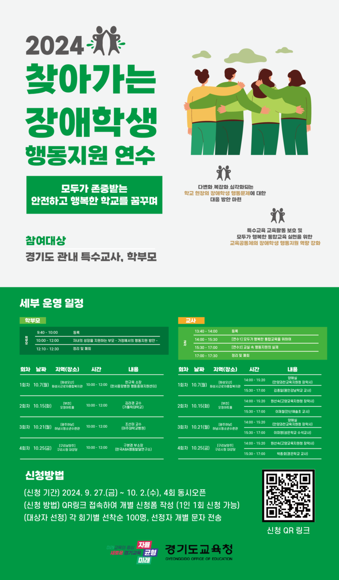 [수원=임종인 기자] 경기도교육청이 장애학생의 행동 문제로 어려움을 겪고 있는 특수교육 현장을 지원하고자 ‘2024 찾아가는 장애학생 행동지원 연수’를 운영한다.