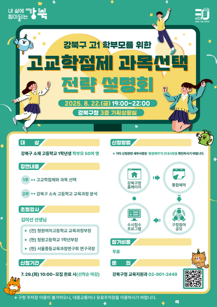 [시민일보 = 문민호 기자] 강북구(구청장 이순희)는 오는 8월22일 오후 7시 구청 기획상황실에서 지역내 고등학교 1학년 학부모를 대상으로 ‘고교학점제 과목선택 전략 설명회’를 개최한다.