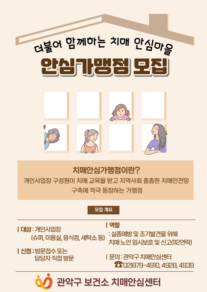 치매안심가맹점 신청은 개인사업자 누구나 가능하며, 가입 및 기타 궁금한 사항은 구 보건소 치매안심센터로 문의하면 된다.