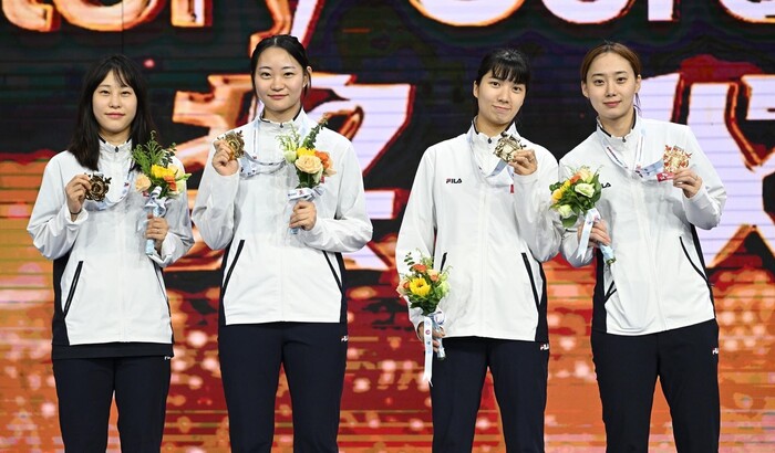 | ▲ 여자 사브르 시상식 기념사진 왼쪽부터 중국팀, 한국팀, 일본팀, 홍콩팀(출처=전남도체육회) |
