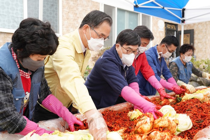 경기 광주시 남종면 봉사단체인 ‘나루터 협동조합’은 최근 지역내 저소득층을 위한 김장나누기 행사를 진행해 자체 예산으로 직접 담근 김장 김치를 지역내 저소득층 25가구에 전달했다. 사진은 이날 행사에 참여한 신동헌 시장(왼쪽 세 번째)과 조합원들이 함께 김장을 하고 있는 모습. (사진제공=광주시청)