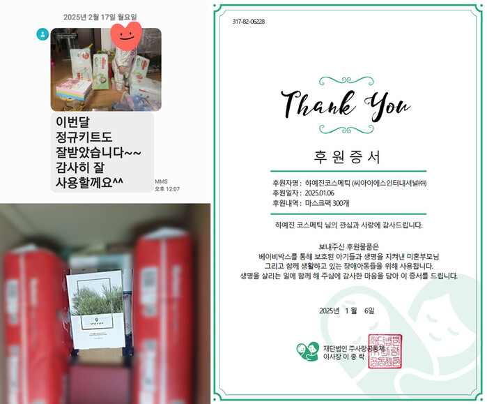2025년 을사년 신년을 맞이하여 기능성 비건 스킨케어 브랜드 하예진은 지난 1월 6일 미혼 부모 가정을 후원하는 재단법인 주사랑공동체 베이비박스(운영자 이종락 목사)에 600만 원 상당의 비건 인증 스킨케어 화장품을 전달했다.