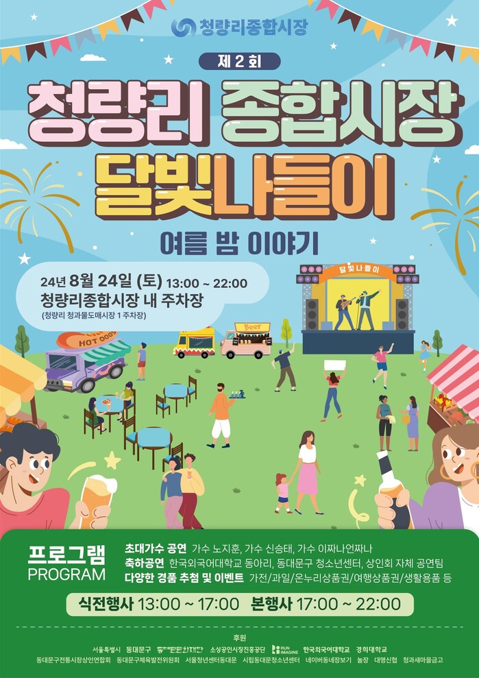 [시민일보 = 이대우 기자] 동대문구(구청장 이필형)가 오는 24일 오후 1~10시 청량리종합시장상인회가 주최하는 제2회 ‘청량리종합시장 달빛나들이’ 축제가 열린다고 밝혔다.