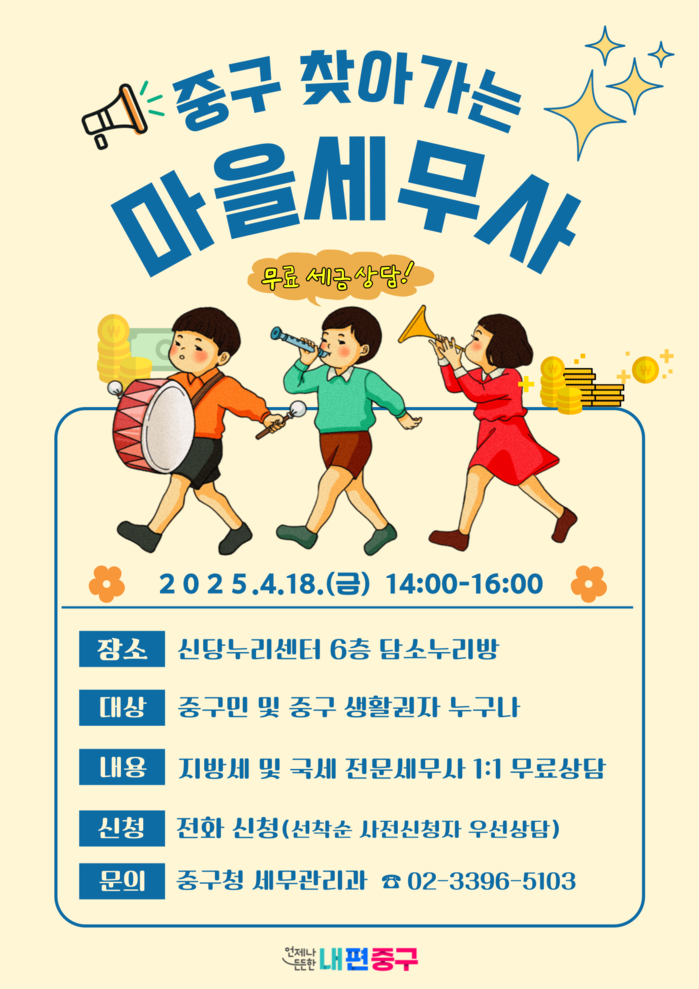 [시민일보 = 여영준 기자] 서울 중구가 오는 18일 오후 2시 신당누리센터 6층에서 ‘찾아가는 마을 세무사’를 운영한다.