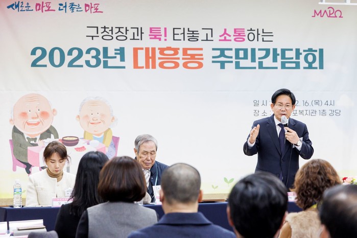 | ▲ 박강수 구청장이 지난 16일 진행된 대흥동 주민감담회에서 주민들과 대화를 나누고 있다. (사진=마포구청 제공) |