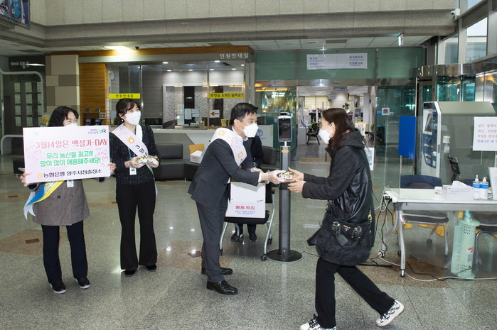 NH농협은행 양주시지부는 14일 백설기데이를 맞이해 우리농산물 소비촉진 및 양주쌀 홍보 일환으로 경기 양주시청 정·후문 출입문에서 백설기 떡을 나눠주는 행사를 개최했다. 사진은 이날 관계자들이 시민들에게 백설기 떡을 나눠주고 있는 모습. (사진제공=양주시청)