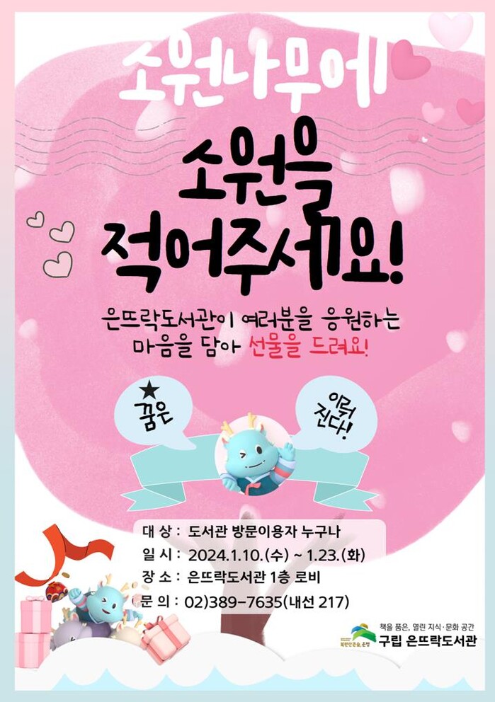 [시민일보 = 이대우 기자] 서울 은평구(구청장 김미경)는 구립은뜨락도서관에서 신년을 맞아 도서관 방문 이용자를 대상으로 2024년 '소원나무'를 운영한다고 밝혔다.