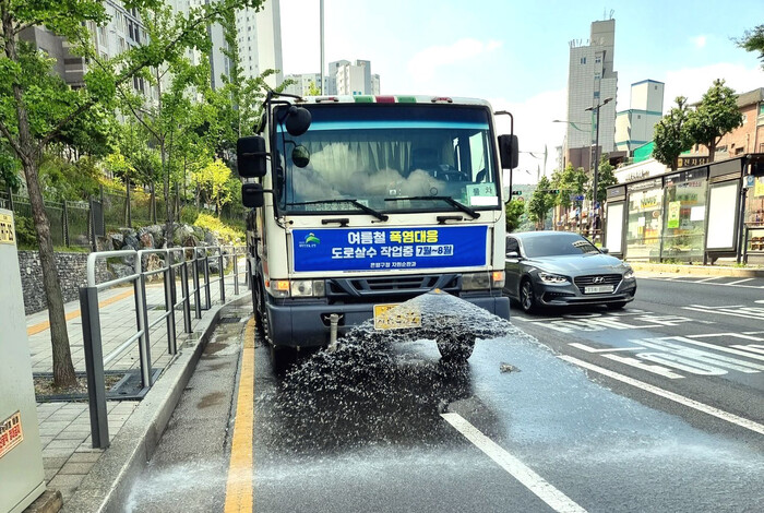 | ▲ 폭염 피해 저감 대책으로 투입된 살수차가 도로에 물을 뿌리고 있다. (사진=은평구청 제공) |