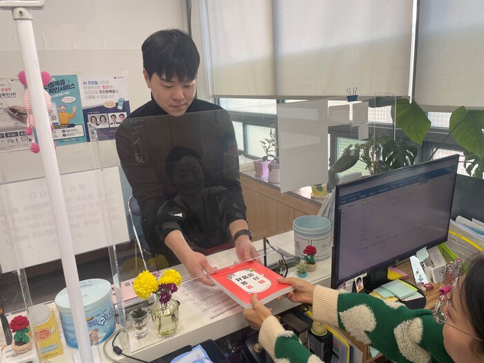 | ▲ 성산2동에 새로 전입한 주민에게 공무원이 '마포사용설명서' 안내 책자를 건네고 있다. (사진=마포구청 제공) |