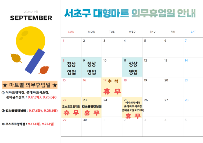 이에 따라 코스트코 양재점은 오는 8일, 킴스클럽 강남점은 9일, 이마트 양재점과 롯데마트 서초점, 준대규모 점포 31곳은 11일인 휴업일을 추석 당일인 17일로 변경한다.