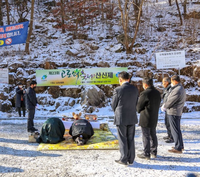 경기 양평군 단월면 고로쇠축제추진위원회는 오는 2월부터 진행되는 고로쇠 수액 채취를 앞두고 최근 석산리 석간수 주차장에서 산신제를 봉행해 마을의 안녕과 안전한 축제를 기원했다. 사진은 이날 산신제를 진행하고 있는 모습. (사진제공=양평군청)