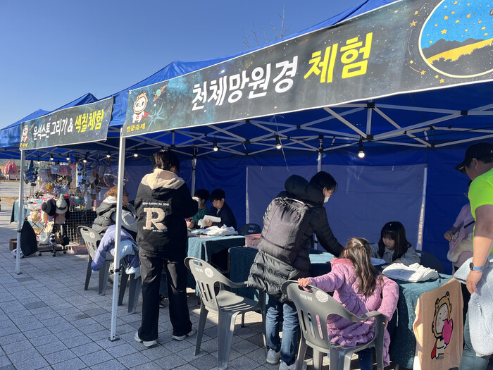 ‘운석스톤 그리기’, ‘별쿵 에코백 색칠하기’, ‘나만의 운석풍선 만들기’, ‘별쿵 보물찾기’, ‘소원나무 별카드 쓰기’,‘운석 영상홍보관’ 등 다채로운 프로그램은 아이들에게 우주에 대한 호기심을, 어른들에게는 색다른 추억을 선사했다. 특히 해가 진 뒤에는 대구대학교 지구과학교육과 교수와 학생들이 준비한 ‘천체망원경 체험’이 큰 인기를 끌었다.