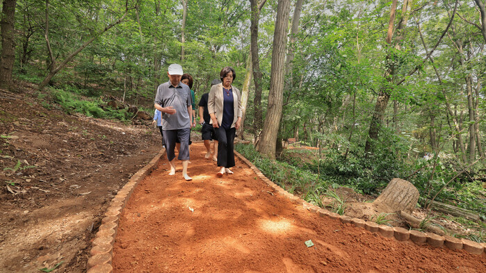 경기 과천시는 청계산 5ㆍ6호 약수터 인근(문원동 306)에 조성한 ‘청계산 황톳길’의 개장식을 31일 개최했다. 개장식에는 신계용 시장과 지역 단체장, 주민 등이 함께 참석해 현장을 둘러봤다. 사진은 신 시장이 황톳길을 걷는 모습. (사진=과천시청 제공)