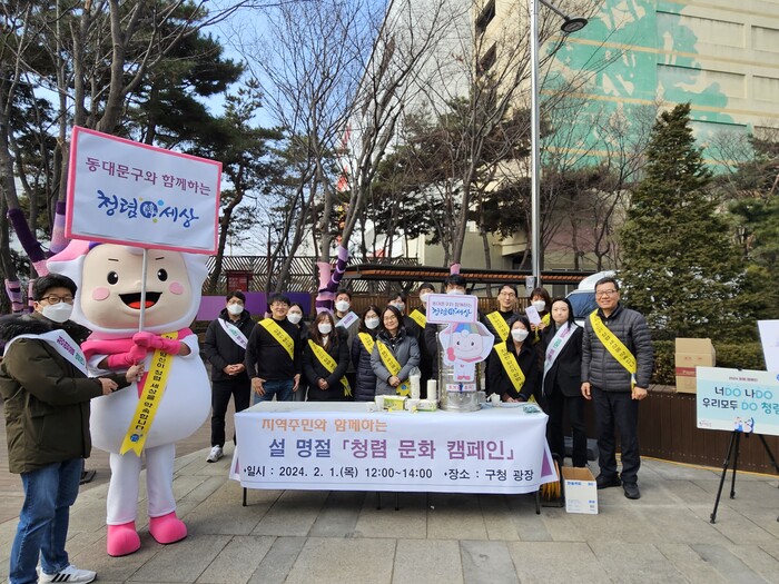 [시민일보 = 이대우 기자] 서울 동대문구(구청장 이필형)가 구민과의 소통으로 투명한 동대문구를 실현하기 위해, 최근 설을 맞아 구청 앞 광장에서 지역주민과 함께하는 ‘청렴 문화 캠페인’을 실시했다.