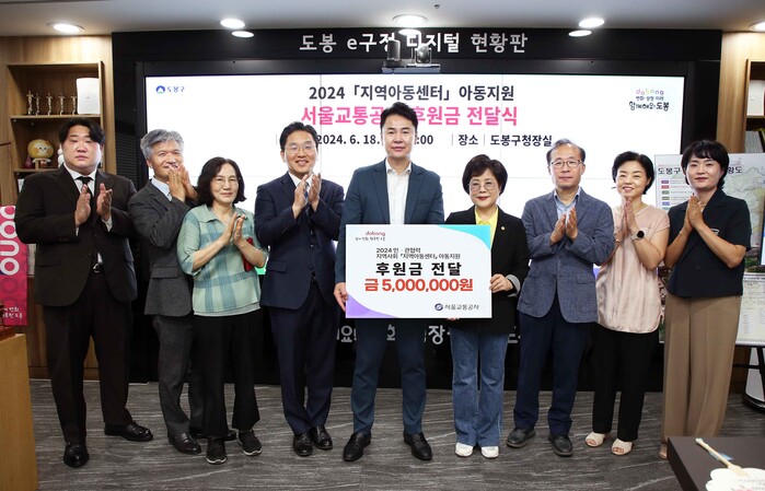 도봉구는 지난 18일 서울교통공사로부터 ‘임직원 급여끝전 모금액’을 전달받았다. 이번 모금액은 직원들이 자율적으로 모은 후원금이며, 후원금은 지역내 총 17곳 지역아동센터에 전달됐다. 사진은 전달식에 참석한 오언석 구청장(가운데)이 관계자들과 기념촬영을 하고 있는 모습. (사진=도봉구청 제공)