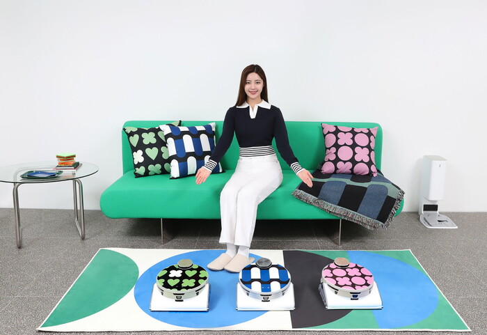 | ▲ 삼성전자 모델이 패턴 디자인 브랜드 '드롭드롭드롭'의 인기 패턴에 시각적 접근성을 높인 '비스포크 제트 봇 AI' 스페셜 에디션을 소개하고 있는 모습.(사진=삼성전자 제공) |