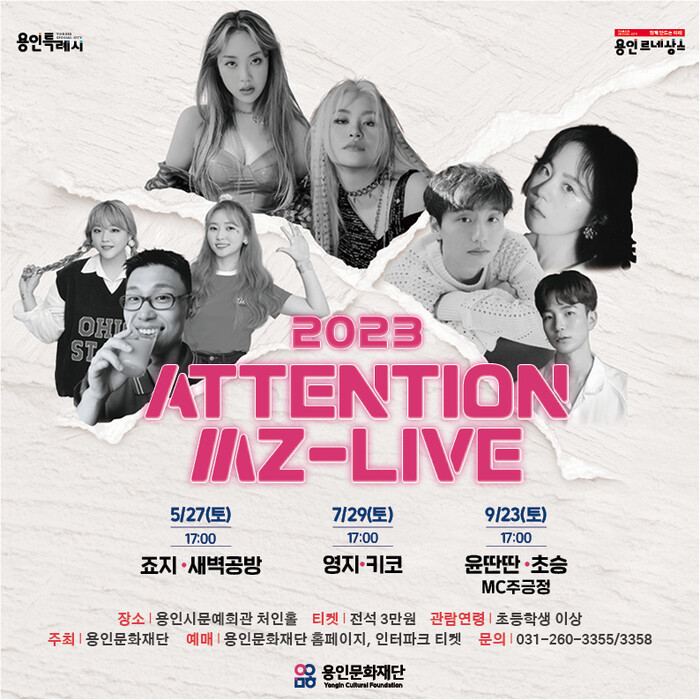 [용인=오왕석 기자] 용인문화재단(이사장 이상일)은 오는 7월 29일 용인시문예회관 처인홀에서 <2023 어텐션 엠지 라이브(ATTENTION MZ – Live) : 영지X키코> 공연을 개최한다.