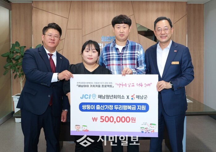 이번 전달식에는 명현관 해남군수, 이보훈 해남청년회의소 회장과 김민수 사무국장이 참여해 이효동·김해주 출산가정에 두리행복금을 전달했다.