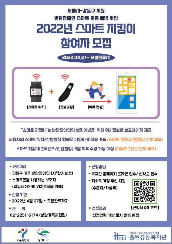 올해도 강동구 거주 발달장애인 72명을 신규로 지원하며, 현재 신청자를 모집 중에 있다. 신청을 원할 경우, 홀트강동복지관 상담가족지원팀으로 전화하면 되고 기기 소진 시까지 신청을 받는다.