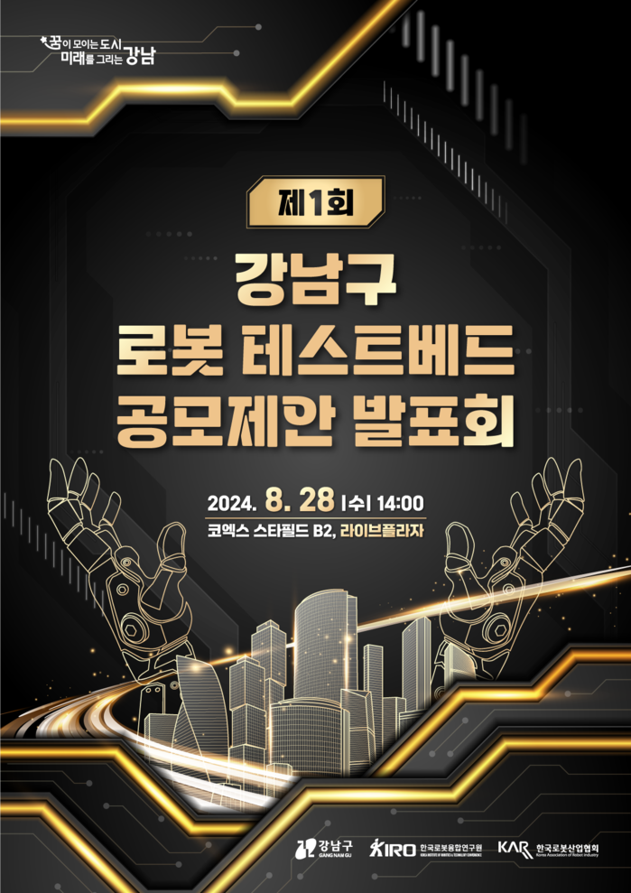 [시민일보 = 이대우 기자] 강남구(구청장 조성명)가 오는 28일 오후 2~4시 코엑스 라이브플라자(지하 2층)에서 ‘제1회 강남구 행정수요 맞춤형 로봇 테스트베드 공모제안 발표회’를 개최한다.
