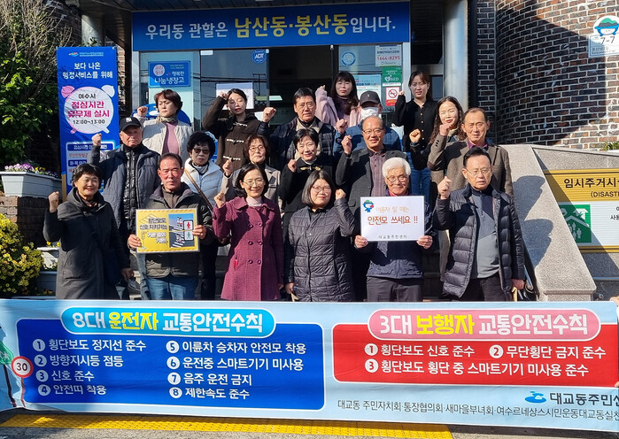 이날 대교동 통장들과 주민센터 직원 20여 명은 ‘여수시민 11대 중점 교통안전수칙, 대교동민은 꼭 지켜요’라는 슬로건으로 8대 운전자 교통안전수칙과 3대 보행자 교통안전수칙 준수 캠페인을 진행했다.