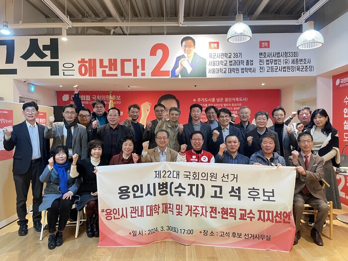[용인=오왕석 기자] 용인시 관내 대학에서 재직중이거나 거주하는 전·현직 대학교수 55명이 수지구 풍덕천동 소재 하나로프라자에서 제22대 국민의힘 국회의원 선거 용인시병(수지) 고석 후보에 대한 지지를 공식적으로 선언했다.