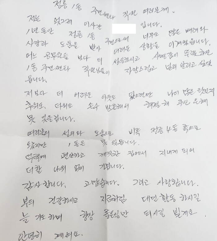 [시민일보 = 변은선 기자] 서울 성북구(구청장 이승로) 정릉1동 주민센터에 편지 한 통이 도착했다. 정릉1동에 거주하다 전세임대로 선정되어 다른 곳으로 이사를 간 82세의 어르신이 보내는 감사 편지였다.