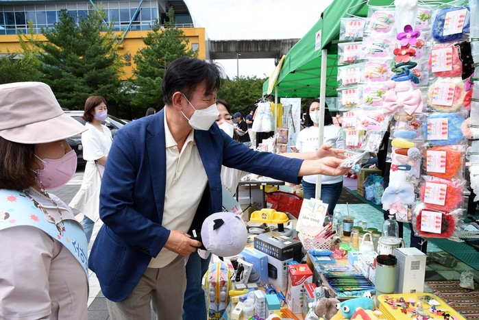 경기 의정부시는 지난 3일 의정부시어린이집연합회 소속 공립·법인·직장어린이집에서 주관한 '2022년 제12회 소아암 어린이 돕기 일일 바자회'를 성황리에 개최했다. 물품을 기증받아 판매한 수익금을 연말에 소아암 어린이 돕기 성금으로 전달할 계획이다. 사진은 행사에 참여한 김동근 시장(오른쪽)이 물건을 둘러보고 있는 모습. (사진제공=의정부시청)
