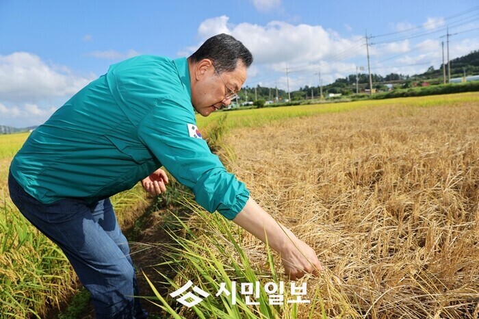 | ▲ 명현관 해남군수가 벼 멸구로 고사된 볏잎을 점검하고 있다. / 해남군 제공 |