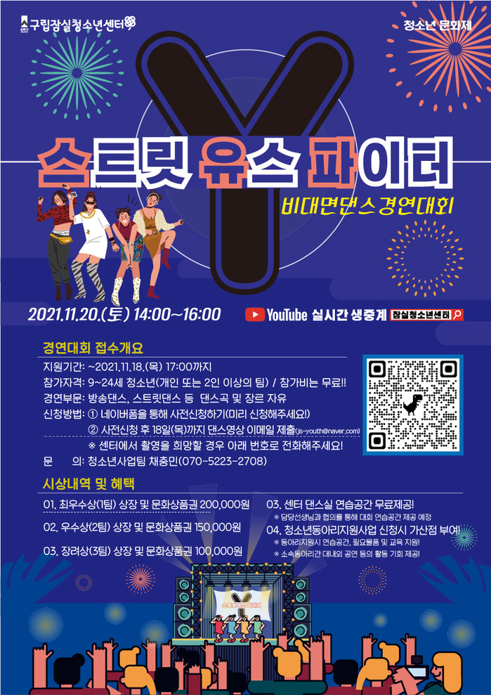 1차 예선은 지원자가 제출한 댄스영상을 통해 비대면 심사로 진행하고, 2차 본선은 오는 20일 오후 2시부터 잠실청소년센터 유튜브 채널을 통해 ‘스트릿 유스 파이터’ 본 경연이 펼쳐진다.